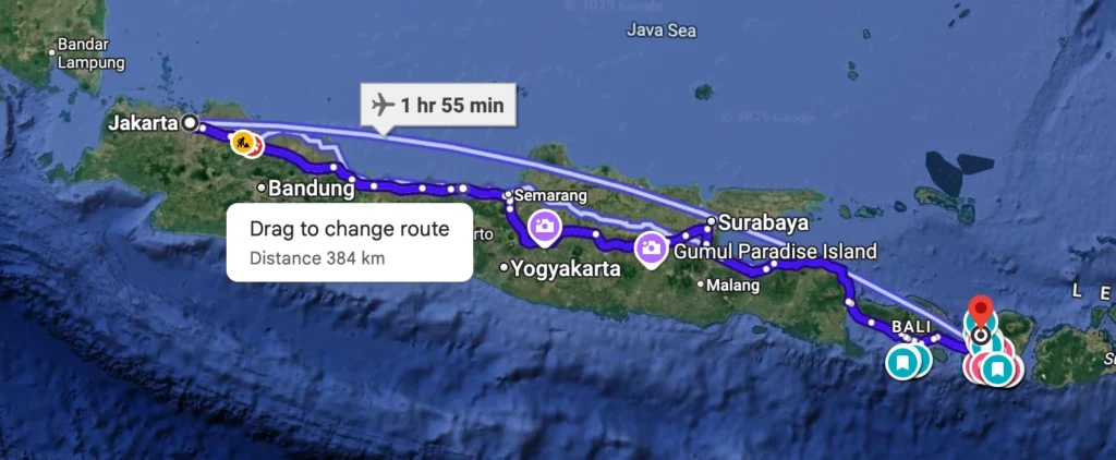 - Step 1: Fly from Jakarta to Bali (DPS) (~1.5 hours)